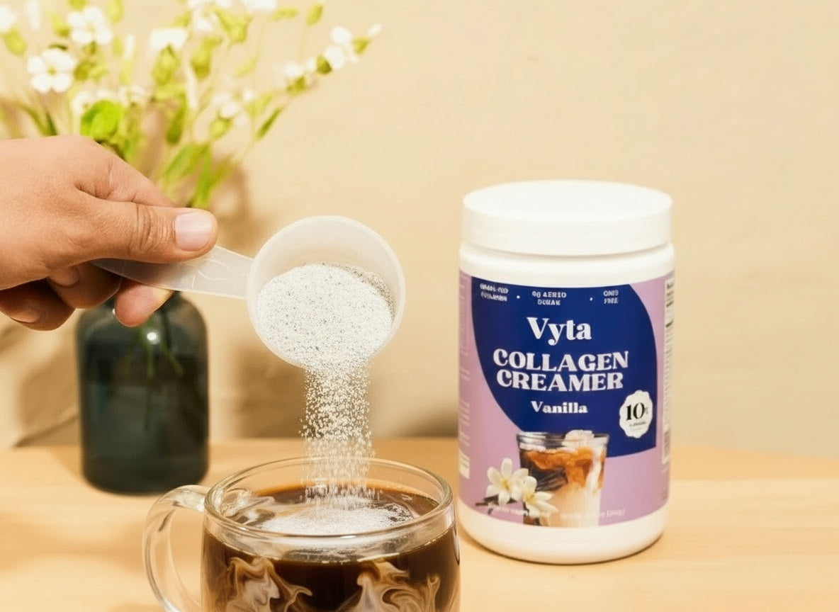 Vyta Collagen Creamer is the first formula designed specifically for women over 35 navigating hormonal changes. Each scoop delivers 10g of grass-fed collagen plus protein, MCT oils, and calcium—everything your body needs in one delicious ritual. No gritty texture. No half-empty jars. No choosing between results and taste. Finally, a collagen creamer that supports your skin, hair, joints, and energy without compromise.